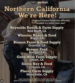 Maverick Livestock Supply connects Cowboy Choice Feeds with local feed stores across California.